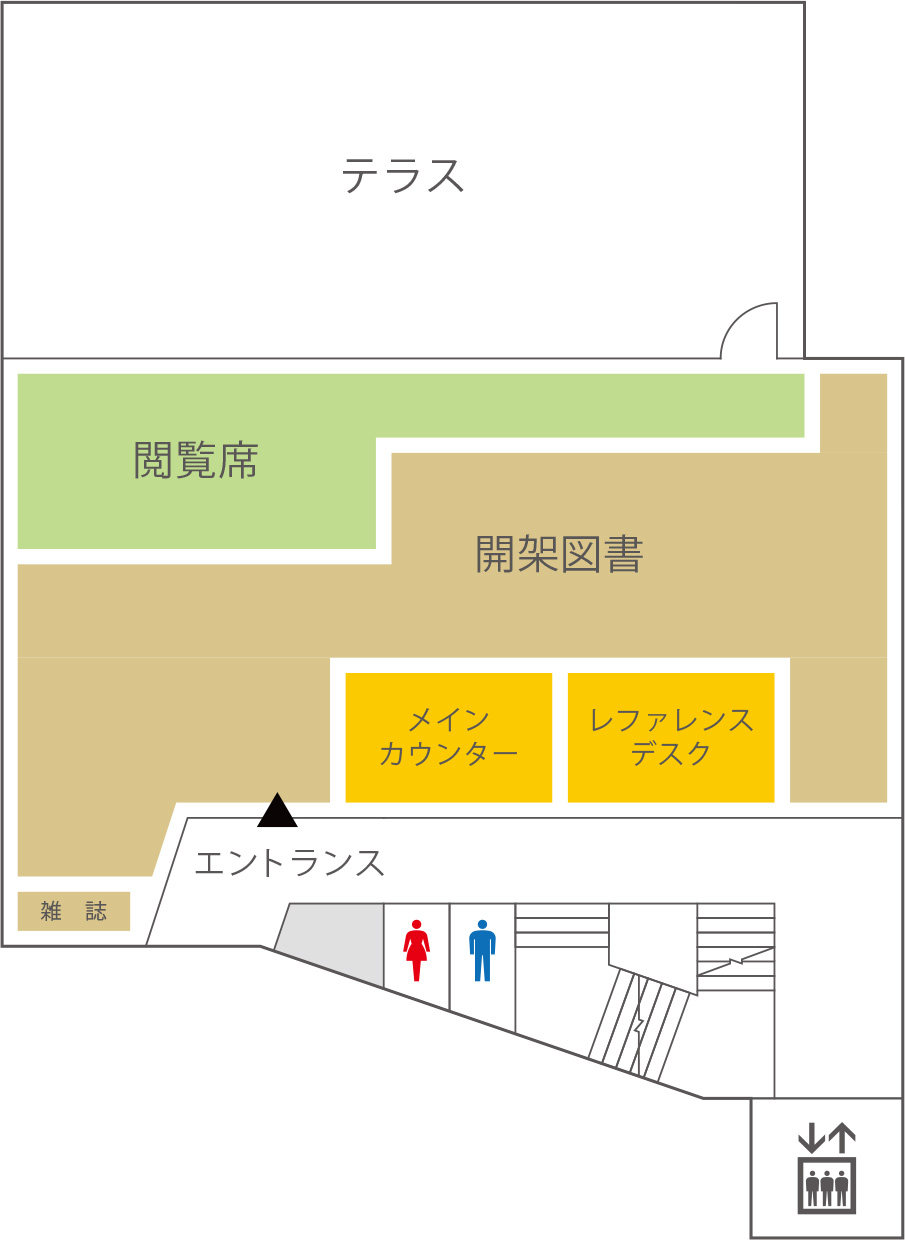 図書館出入口(エントランス)があります。メインカウンターでは、貸出・返却のほか各種手続きを行います。レファレンスデスクでは各種相談に応じます。そのほか資料検索(OPAC)用端末、開架図書(音楽/一般和書)、雑誌、参考図書、国立国会図書館デジタル送信サービス専用端末などがあります
