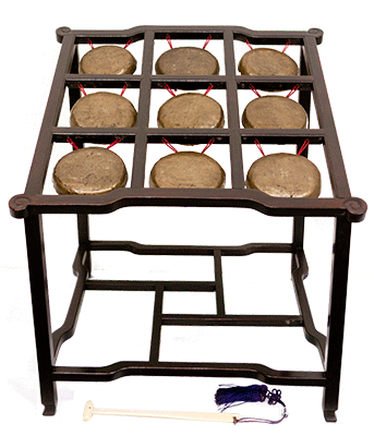 元の頃からすでに愛用された楽器で、銅鑼の数には様々なものがあり清代前期には二十四個のものが作られたが、近代では九個と十個組のものが一般である。